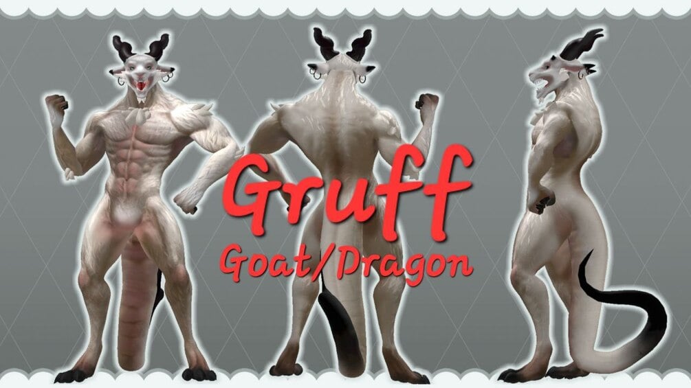 Gruff is a large muscular softy Goat/Dragon hybrid. A rare breed indeed, with many horn options to choose from, muscle physics, a long tongue and piercing green eyes. He also comes with a special Holiday Krampus outfit to play around with too!